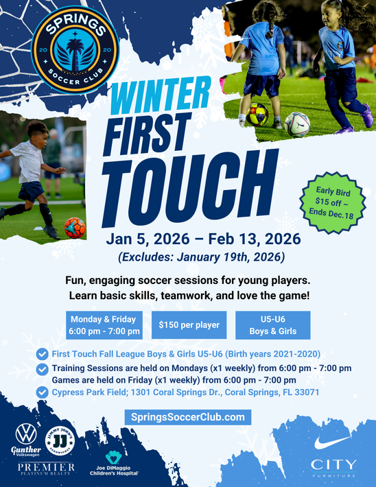 Get ready for South Florida's premier winter soccer event! The Springs Holiday Cup invites Boys' and Girls' teams from U8 to U19 to compete in a highly organized and competitive tournament across multiple locations.
