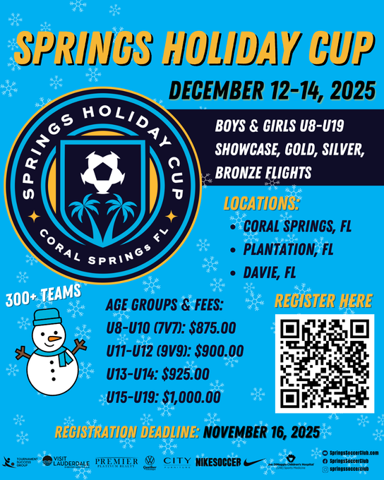 Get ready for South Florida's premier winter soccer event! The Springs Holiday Cup invites Boys' and Girls' teams from U8 to U19 to compete in a highly organized and competitive tournament across multiple locations.