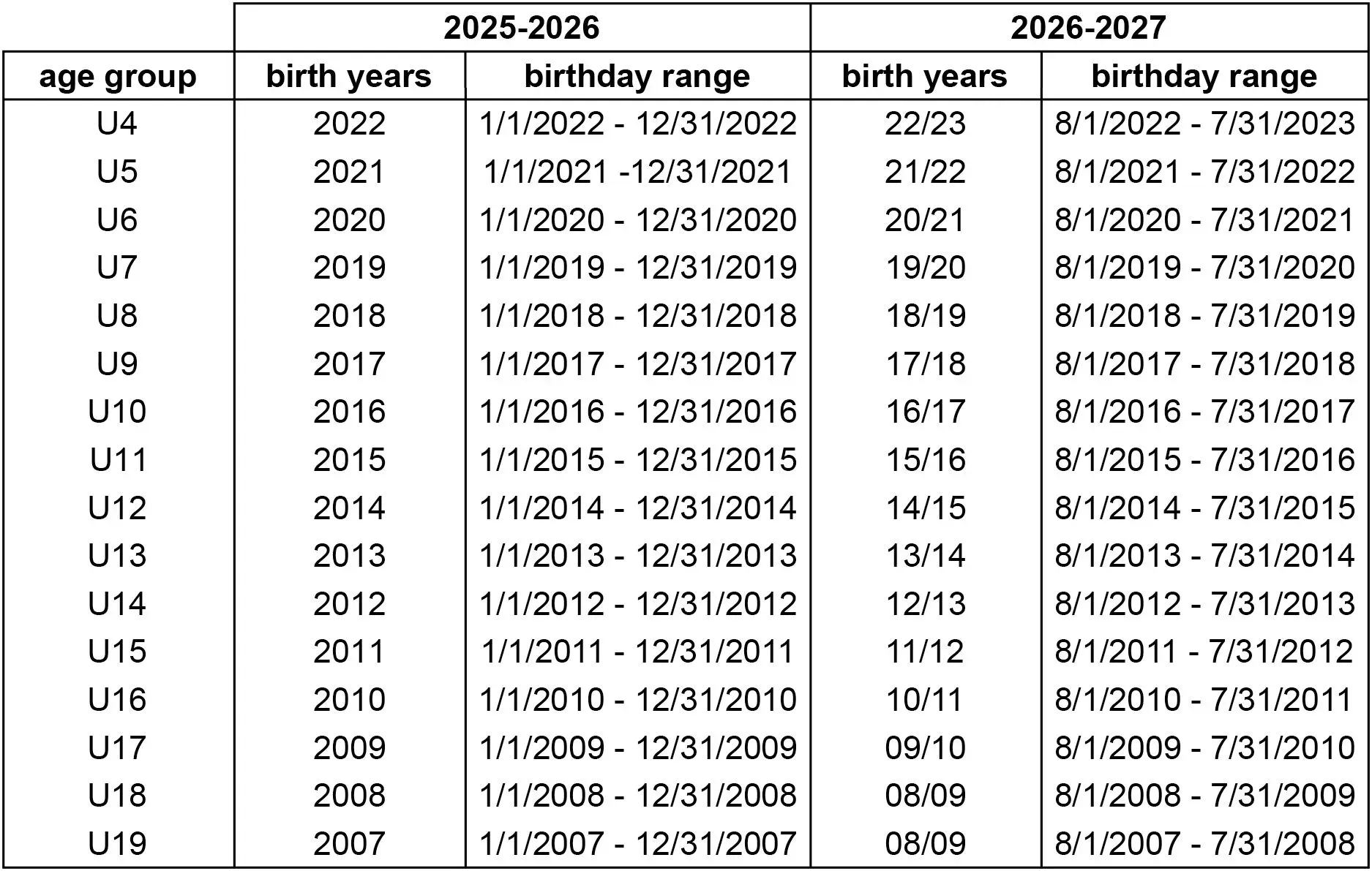 EXAMPLE: In the 2026-2027 seasonal year, if your child is born in October 2016, they fall within the school year range of August 1, 2016 - July 31, 2017. That places them in the U10 age group for the 2026-2027 season.